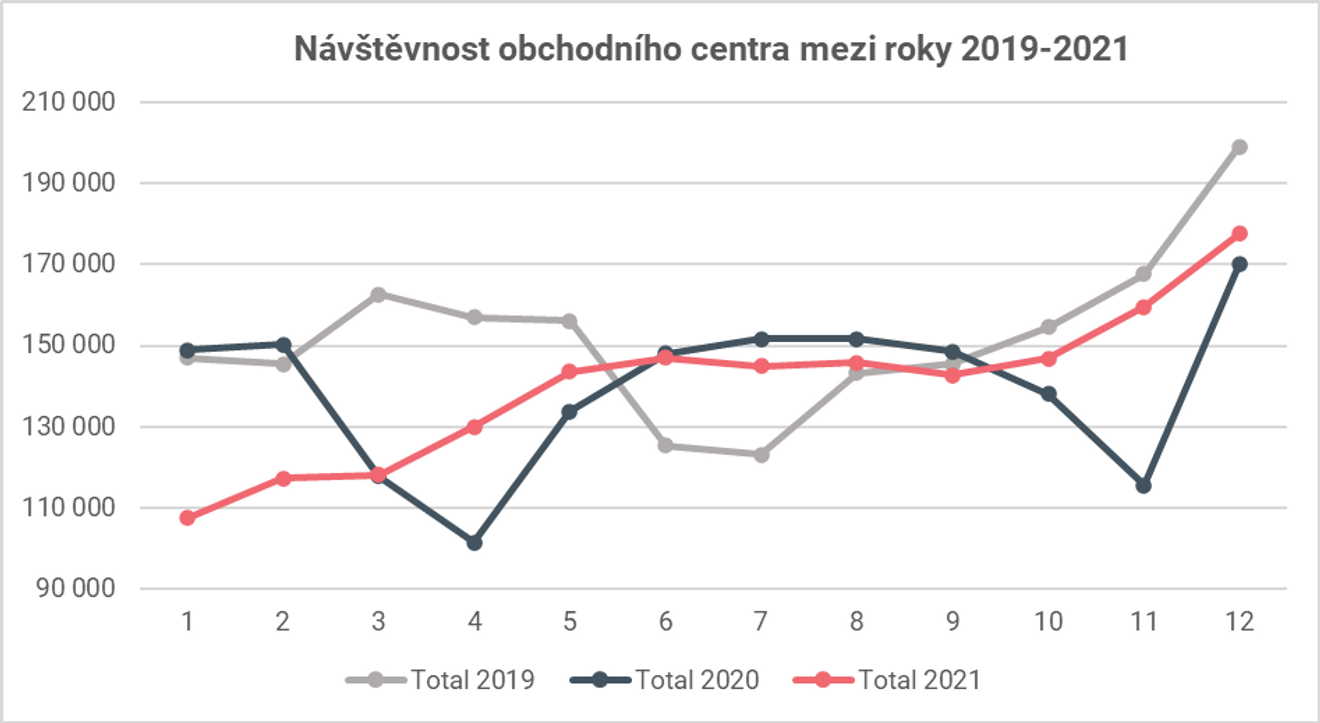 Za uplynulý rok 2021 došlo k navýšení obratů o 6,8 % oproti předchozímu roku 2020. Ve srovnání s rokem 2019 jde dokonce o nárůst 17,8 %. Co se návštěvnosti týká, celý rok 2021 vykazuje mírný nárůst o 0,3 % ve srovnání s rokem 2020, ale pokles 8 % vůči roku 2019, což je dáno omezením center z důvodu covid lockdownů. Vidíme tedy, že výrazně narůstá průměrný nákupní košík, což přičítáme jak změně chování návštěvníků centra (méně často větší nákup), tak i zlepšující se úrovni nájemců, ale i rostoucí inflaci, která má vliv na cenu zboží a služeb.