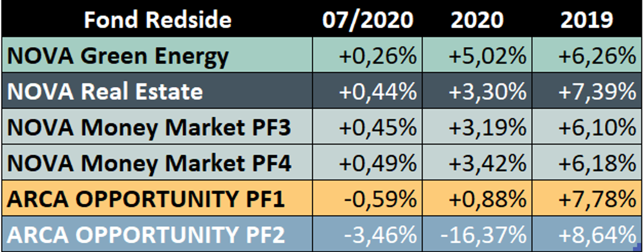 NOVA Green Energy zaznamenal podprůměrný výkon, protože výroba fotovoltaických elektráren v červenci byla o 15 % nižší než plán energetického auditu. V obchodním centru Orlice v Hradci Králové (patřícího do fondu NOVA Real Estate) se nám podařilo podepsat nájemní smlouvu s přední sázkovou kanceláří. Oba podfondy fondu ARCA OPPORTUNITY zaznamenaly negativní měsíční výkonnost. Na tomto faktu se podepsaly zejména poklesy aktiv na globálních akciových trzích.