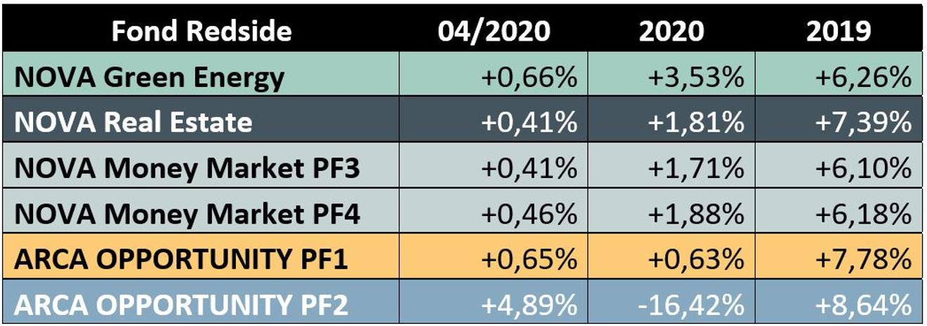 Podfond 1 fondu ARCA OPPORTUNITY dosáhl zhodnocení v souladu s jeho defenzivní strategií. Kromě stabilních výnosů private equity projektů k výsledku výrazně přispěla také akciová složka portfolia. Výjimečný výsledek dosáhl náš čistě akciový podfond 2. Stalo se tak po dubnovém výrazném oživení na kapitálových trzích. NOVA Green Energy pokračoval v nadprůměrném výkonu a zaznamenal dokonce nejlepší první čtvrtletí roku v historii fondu. Zhodnocení fondů NOVA Real Estate i NOVA Money Market bylo v souladu s očekáváním.