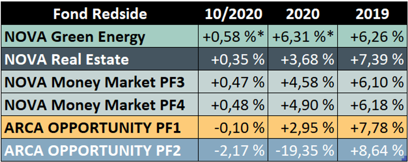 Výroba fotovoltaických elektráren NOVA Green Energy nedosáhla na plán energetického auditu o 15 % a to vlivem nízkého osvitu. Bioplynové stanice a biomasová teplárna v Krnči byly na očekávaném průměru. V rámci nemovitostního portfolia NOVA Real Estate bylo vládními omezeními v oblasti retailu přímo ovlivněné jen obchodní centrum Orlice v Hradci Králové. Zde jsou zavřené pouze jednotky generující 12 % příjmu této nemovitosti. Pokles akciové složky Podfondu 1 fondu ARCA OPPORTUNITY vyrovnaly zisky private equity projektů. Ryze akciový Podfond 2 fondu ARCA OPPORTUNITY oslabil v souladu s akciovými trhy.